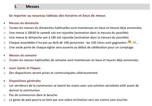 Suite à l’annonce du Président de la République, la paroisse a reçu des directives précises. Vous pouvez consulter ce document ci-dessous qui résume l’application pour la paroisse Saint François des Coteaux.